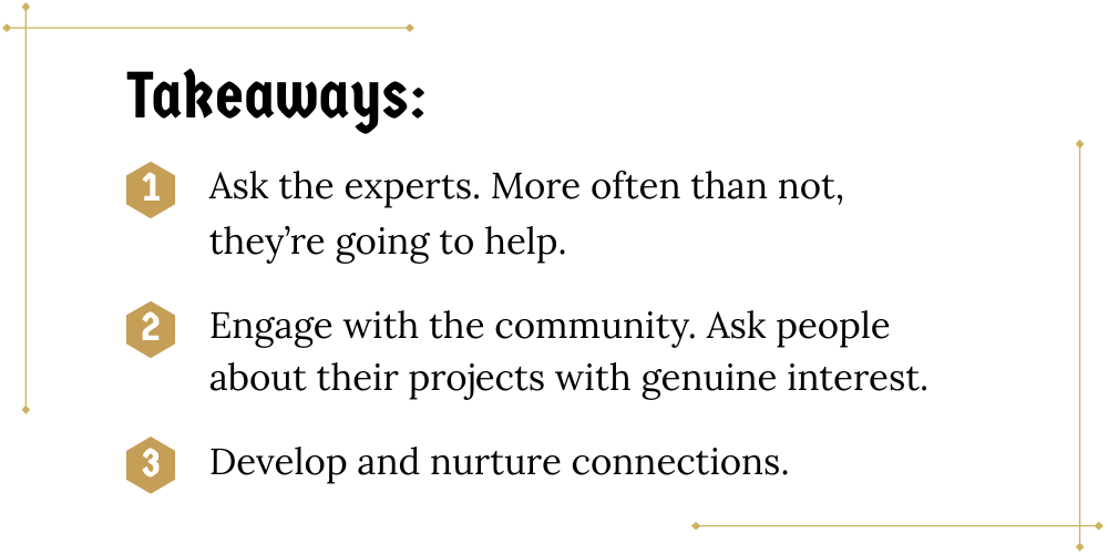 You can meet people at all stages of their career, and in all facets of the field. You can exchange ideas, stories, and laughs. Build connections that can lead to new opportunities that you could never have planned for. Those connections will organically build you up into a better designer, or whatever field you are in. That’s how you make it big, by being big, with each other.